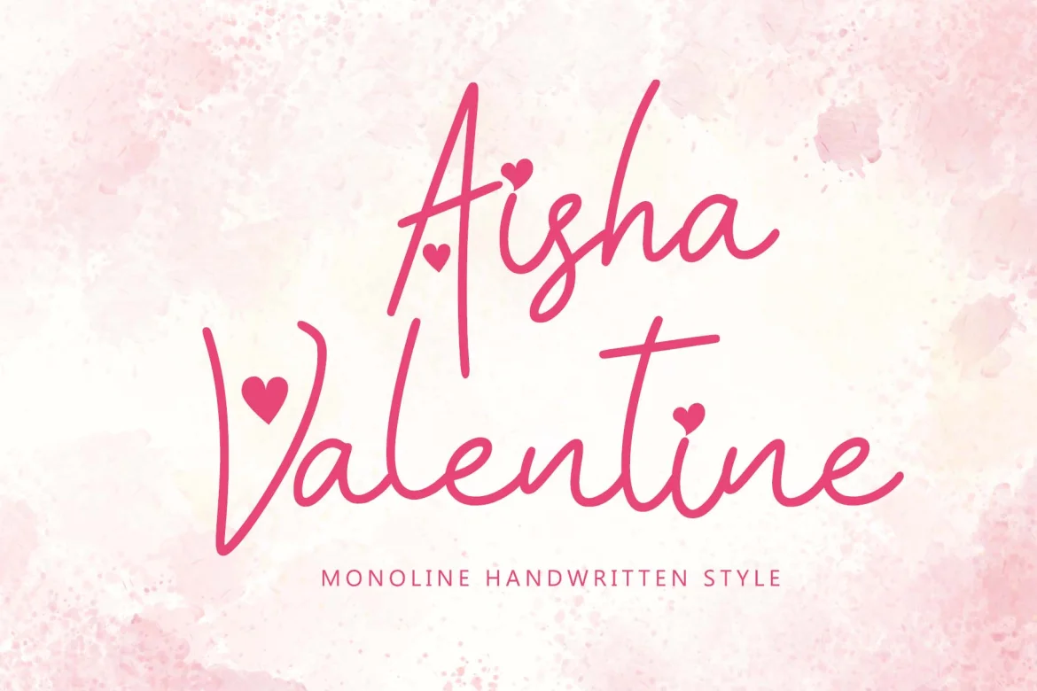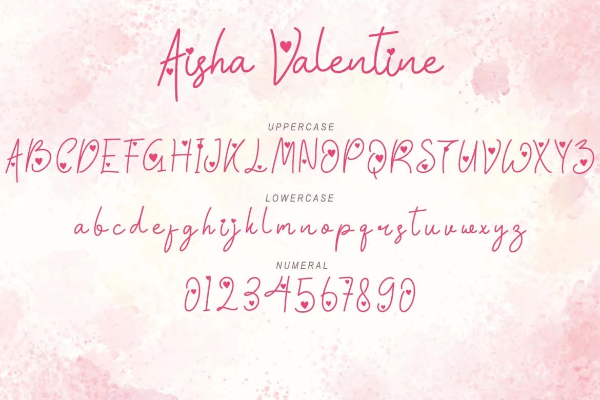 Perfect for adding a touch of romance and elegance, Aisha Valentine is ideal for weddings, invitations, Valentine’s Day themes, banners, posters, prints, branding, stickers, logos, and much more. Whether you’re crafting heartfelt invitations or designing eye-catching branding materials, this font will bring a warm and personal touch to your work. Download it today and let your creativity shine!